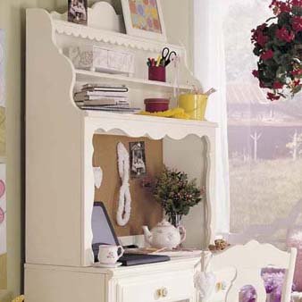 The Lea Spring Garden Large Hutch will brighten up your child's days. The hardwood construction of this storage compartment ensures it will last for many a year. So give your child a place to study and store their things with the Spring Garden Large Hutch. Features: Hutch has white finish Hutch is made of hardwood and wood products Hutch has corkboard back panel on lower section 2 fixed shelves 1 adjustable shelf Cord management opening Perfect for girls Compatible with 418-231 Dresser or 418-341 Desk Specifications: Overall Dimensions: 46" H x 40" W x 12" D Weight: 70 lbs