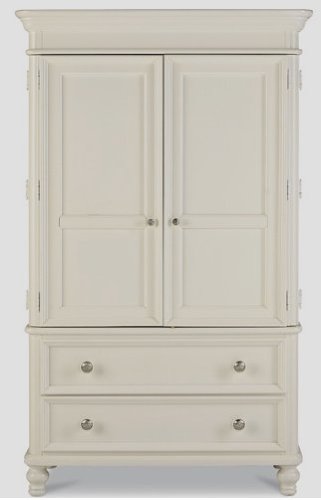 The Pawsitively Yours Armoire by Pulaski is perfect for anyyouth bedroom. There is ample storagespace with twodovetailed drawers with replaceable colored drawer panels and a cabinet witha removableclothes rod and adjustable wooden shelves. A slide out panel makes it easytoinstall a television or computer monitor.The back of thecabinet doors have mirror and cork inserts to help your child get ready and stay organized.This childs bedroom armoire is usually in stock and ships to you at no additional charge.Note: Due to the high quality of Pulaski products, extra care is taken in shipping and handling. Delivery may take 4-6 weeks.Features:Two Dovetailed DrawersTop Drawer with Flip Down Front for Optional Media Usage and StorageReplaceable Colored Drawer Panels for Top DrawerExclusive Customizable Hardware KnobsClothes RodTwo Adjustable Wooden ShelvesDouble Hinged DoorsMirror in Inside of Left DoorCork Panel on Inside Right DoorSlide Out Panel for TVInterior Dimensions for TV 36 W x 15 D x 38 HFull Extension Drawer GuidesDurable ConstructionFinish: VanillaDimension:Armoire (Pulaski Model# 634120 ): w-42.00 in x d-20.00 in x h-70.00 in